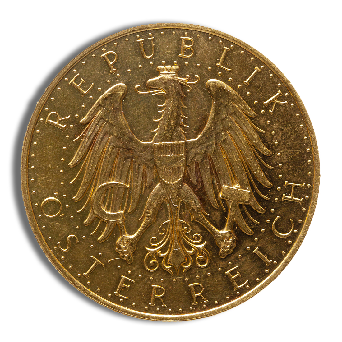 The Austria 100 Schilling Gold Coin radiates timeless elegance, capturing the essence of Austrian heritage and numismatic artistry. Struck in luminous gold, this coin enchants collectors and enthusiasts with its intricate design and historical significance. Its obverse features a portrait of Franz Joseph I, the revered Emperor of Austria, exuding regal charm and authority. The reverse displays the Austrian coat of arms, symbolizing national pride and unity through exquisite craftsmanship.